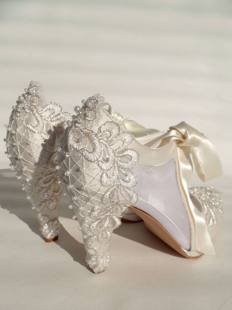 Sheer And Ivory Satin Bridal Shoes With Pearls Etsy