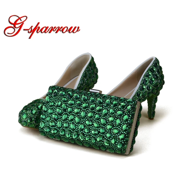 Us 123 99 20 Off Green Rhinestone Handmade Wedding Shoes With Clutch Bag 3 Inches Thin Heel Performance Pumps Party Prom Shoes And Matching Bag In