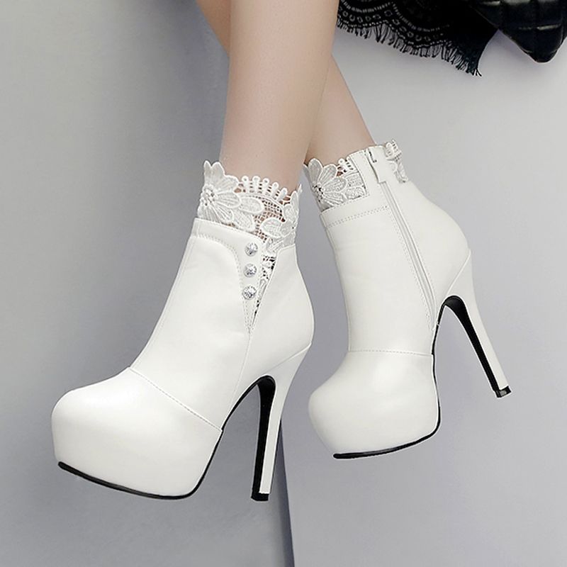Bride Wedding Shoes Boots White Lace Rhinestone High Heel Ankle