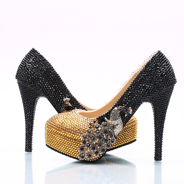 Black And Gold Wedding Heels Embroidered Rhinestone Pumps For