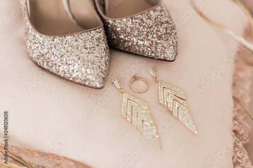 Blush Pink Bridal Shoes And Accenting Jewelry With Gold Floral