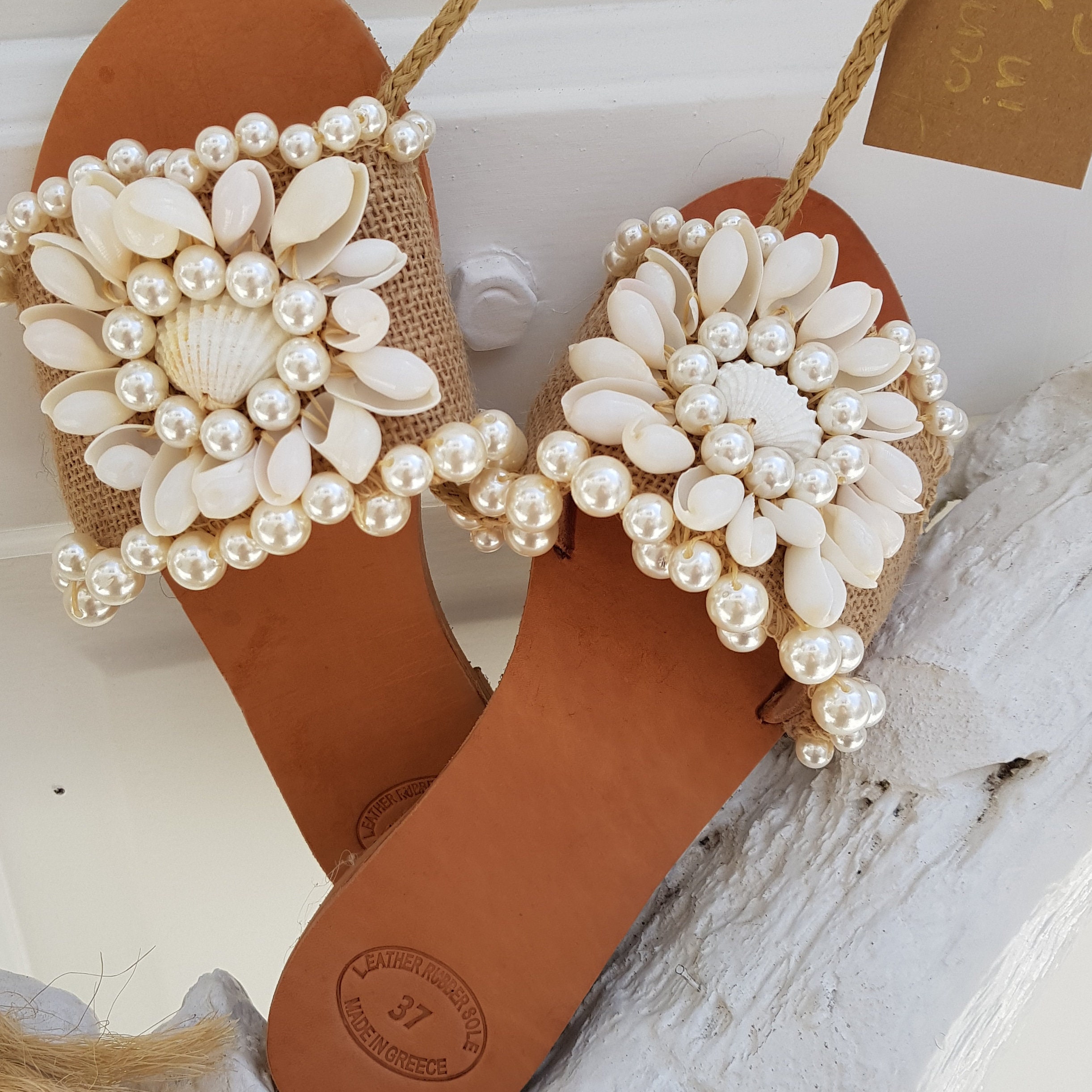 Greek Sandals Seashells Slides Sandals Handmade Boho Wedding Sandals