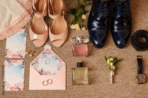 Shoes Of The Bride And Groom Lying Or Standing Next To Each Other