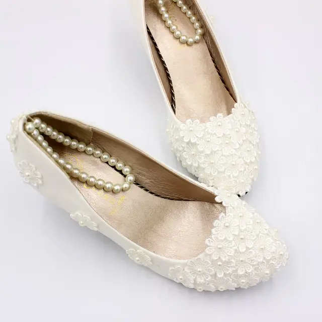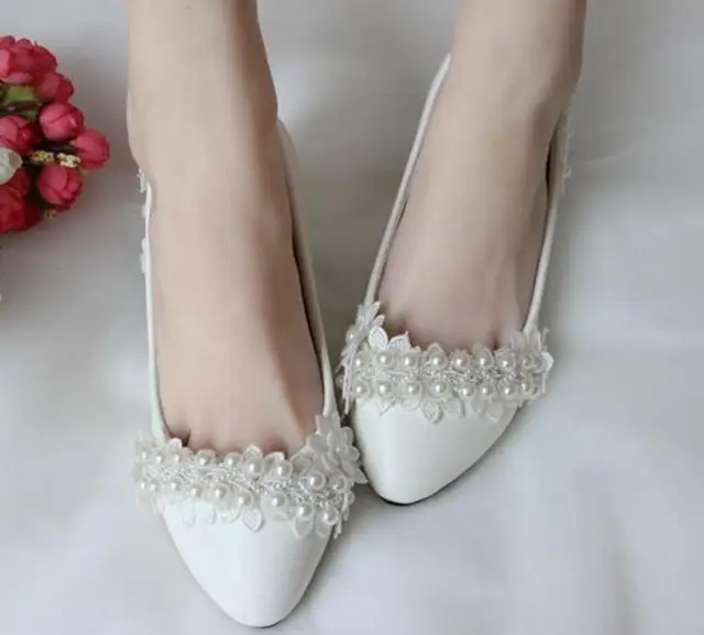 White Wedding Shoes 2018 Newest Design Lace Pearls Beading Female