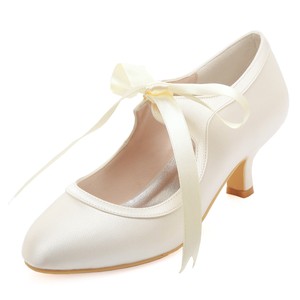 Hc1803 Mary Jane Pumps Mid Heel Closed Toe Ribbon Satin Bridal