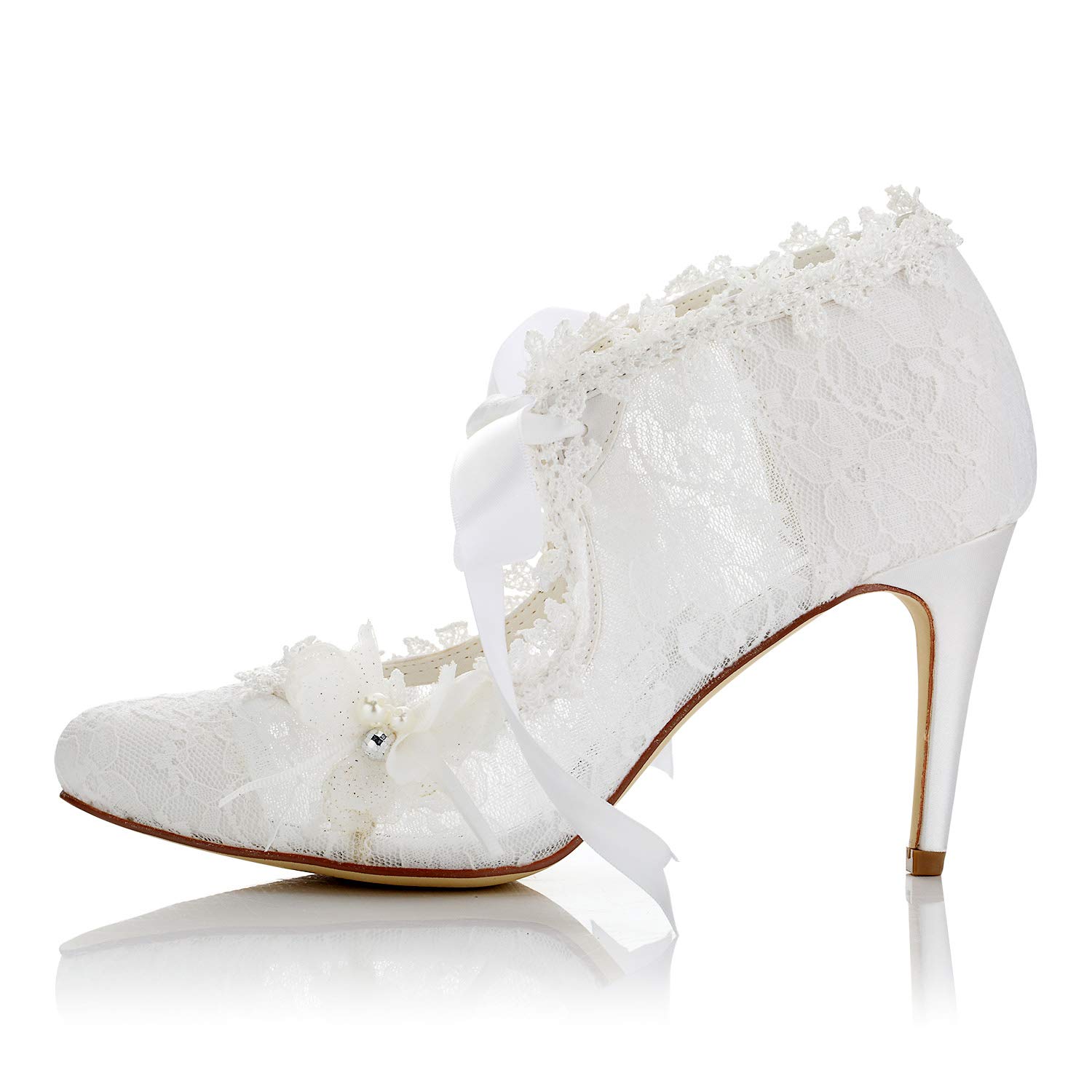Women Mary Jane Pumps Mid Heel Closed Toe Ribbon Lace Bridal Wedding