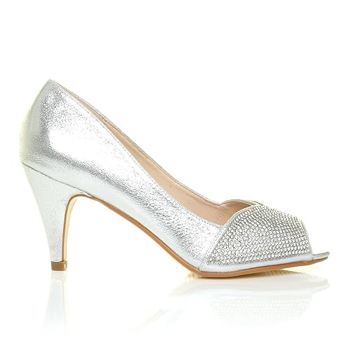 June Silver Shimmer Diamante Peep Toe Mid Heel Embellished Wedding