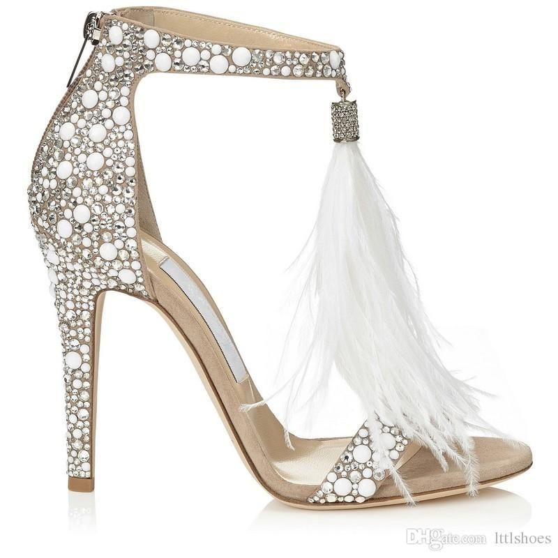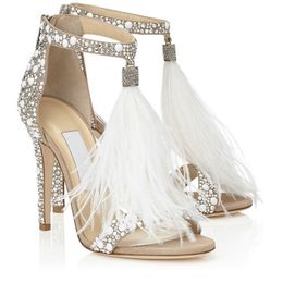 2018 Hot Crystal Embellished White Feather Fringed Rhinestone High Heels Sandals Bridal Wedding Shoes Women Ladies Stiletto Pumps