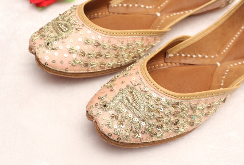 Indian Bridal Wedding Shoes Peacock Women Peach Lehnga Gold Jutti Shoes Wedding Flats Ballet Khussa Shoes Punjabi Shoe Us Women Size 6