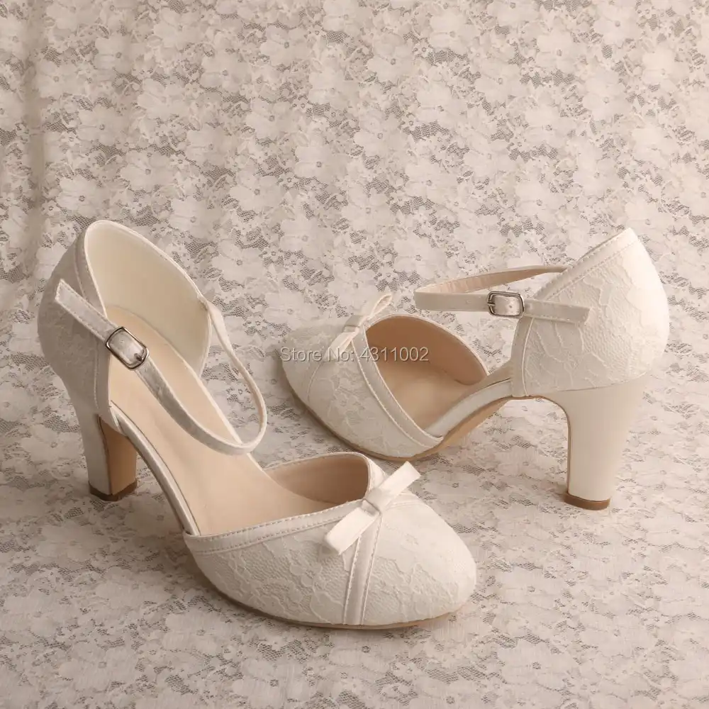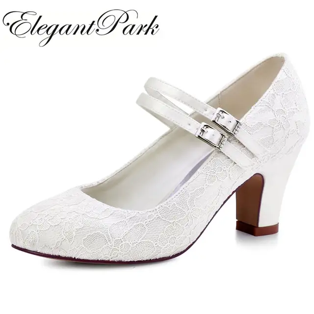 Ivory Lace Heels T Strap Wedding Shoes Chunky Heel Pumps For Formal