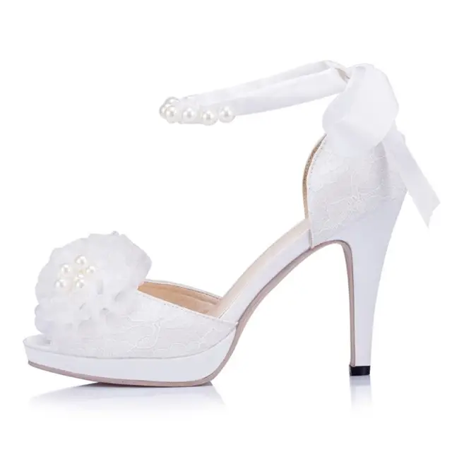 Stiletto Heel Peep Toe Lace Up Pearl Wedding Shoes