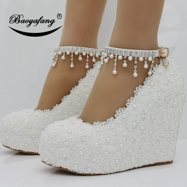 Us 36 31 22 Off Baoyafang New Wedges White Pink Lace Up Wedding Shoes Woman 11cm High Heels Shoes Bridesmaid Fashion Ankle Strap Womens Pumps In
