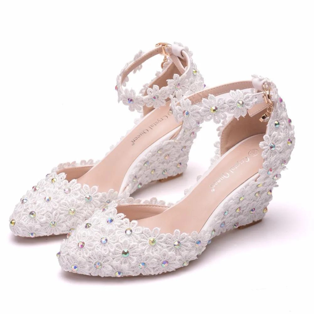 Amazon Com Crystal Queen Wedges Pumps Heels White Lace Wedding