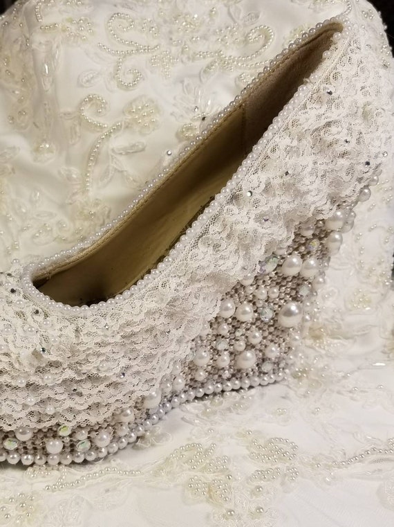 Handmade Women White Pearl Wedding Shoes Wedges Pumps High Heels
