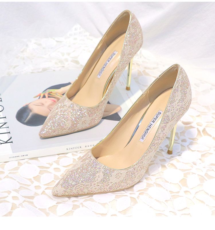 Shining Lace Wedding Shoes For Bride Sequined Stiletto Heel Prom