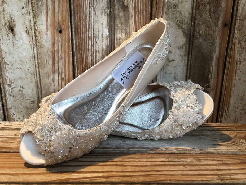 Bridal Lace Satin Flats Open Toe Beaded Lace Flats Peep Toe Etsy