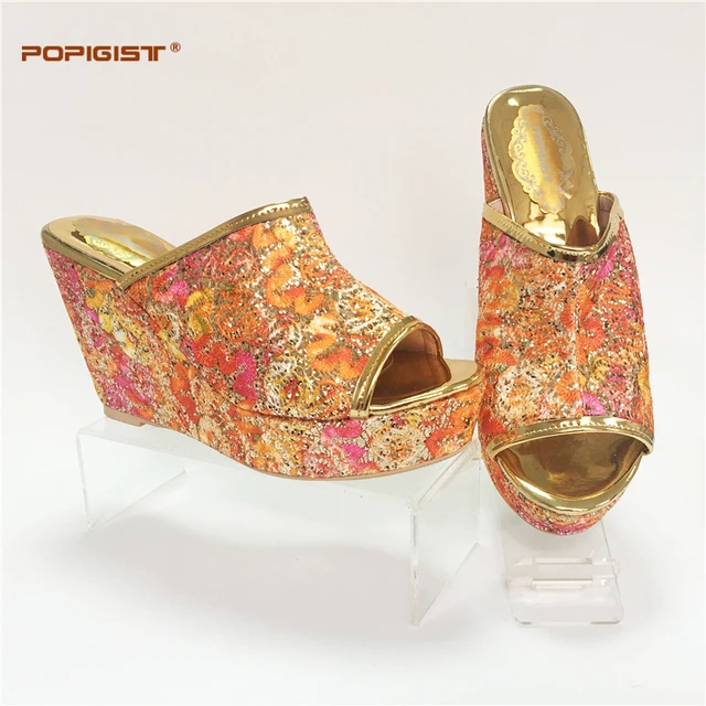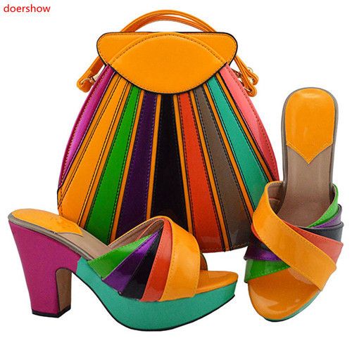 Latest Orange Multi Wedges Heel African Women Shoes And Bag Sets