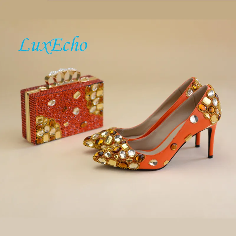 Bs851 Dhl Custom Made Orange Crystal Shoes With Matching Bag