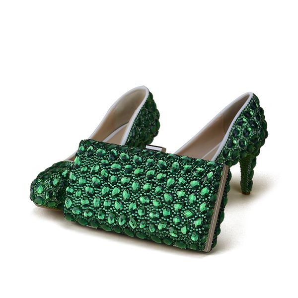 Green Rhinestone Handmade Wedding Shoes With Clutch Bag 3 Inches