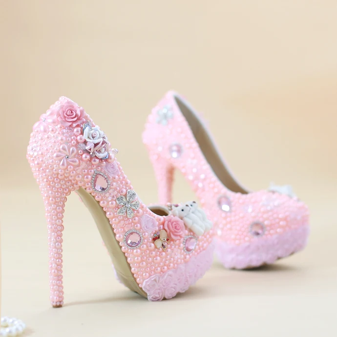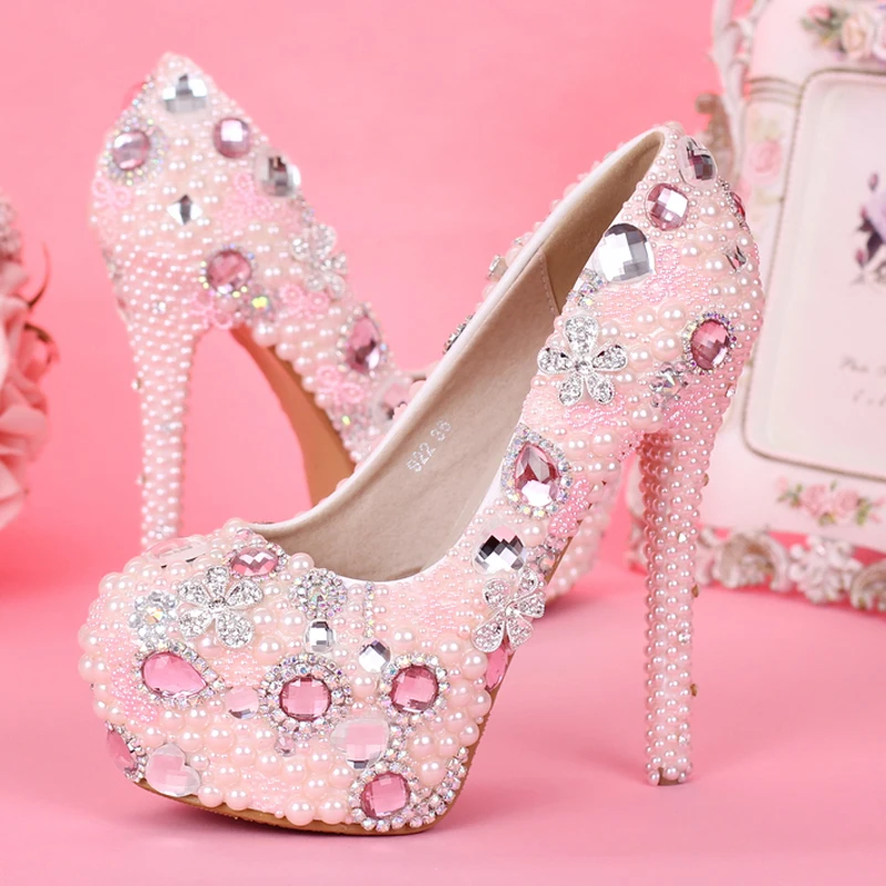 Sweetness Pink Pearls Wedding Shoes Women Rhienstone Pumps Jeweled