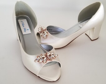 White Bridal Shoes With T Strap Rose Gold Block Heel Peep Toe
