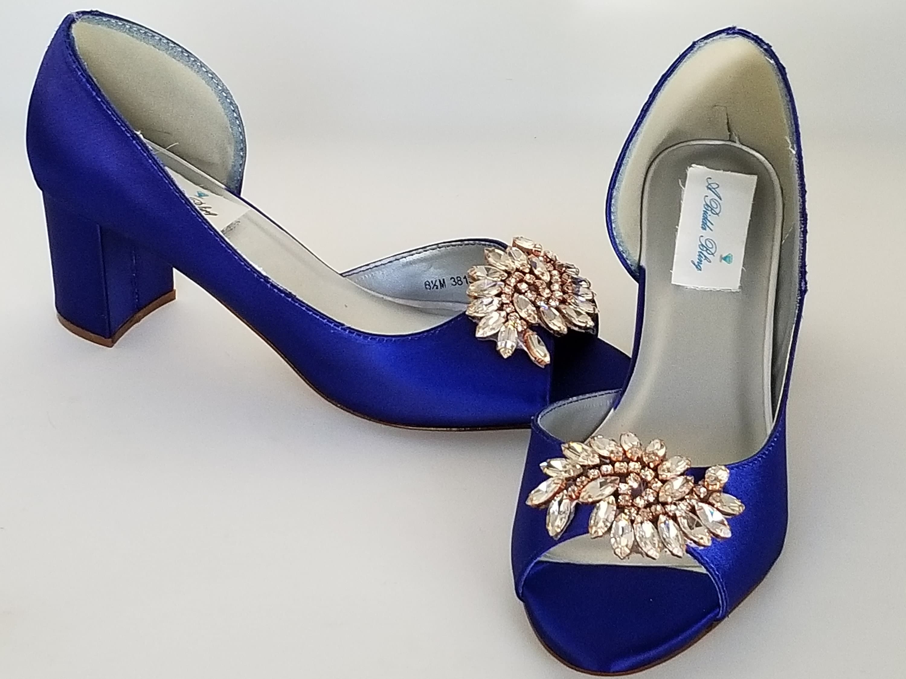 Royal Blue Wedding Shoes Block Heel Rose Gold Crystal Applique Etsy