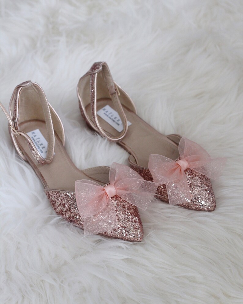 Women Wedding Shoes Bridesmaid Shoes Rose Gold Rock Glitter Pointy Toe Flats With Organza Bow