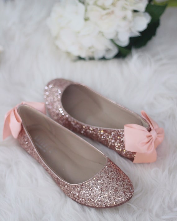 Rose Gold Rock Glitter Flats With Back Satin Bow Bridal Shoes Bridesmaids Shoes Women Wedding Flats