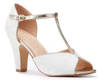 White Bridal Shoes With T Strap Rose Gold Block Heel Peep Toe