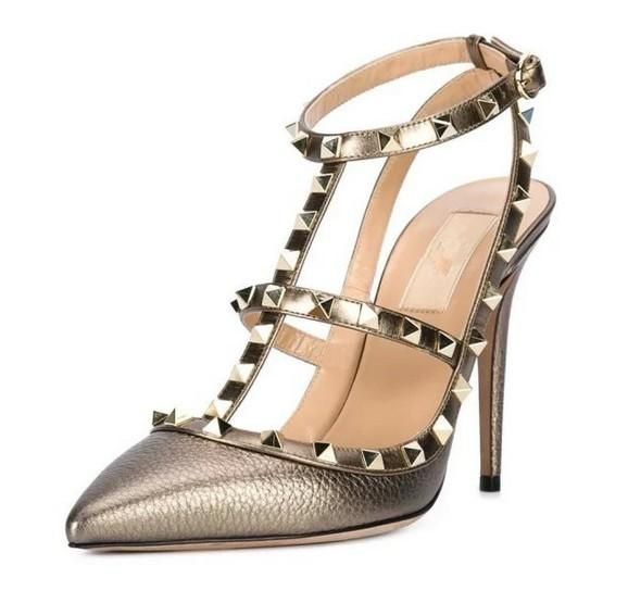Tailor Made High Quality Wedding Shoes 34 41 Genuine Leather Gold Rivets Pointy Flats Heels V Pumps 7 5 10cm Luxury Designer Metallic Shoes