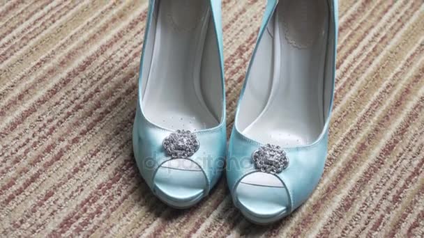 Leather Tiffany Color High Heels Wedding Shoes On The Wooden