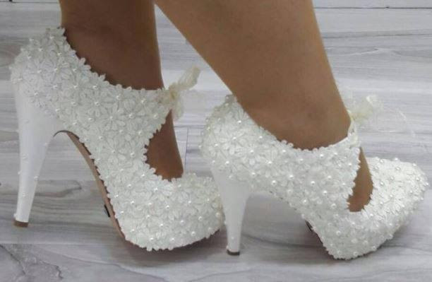 Su Cheny 3 4 Heel White Ivory Lace Ribbon Pearls Wedding Shoes