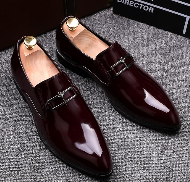 Men Brand Designer Shine Pointed Metal Buckle Formal Shoes Male