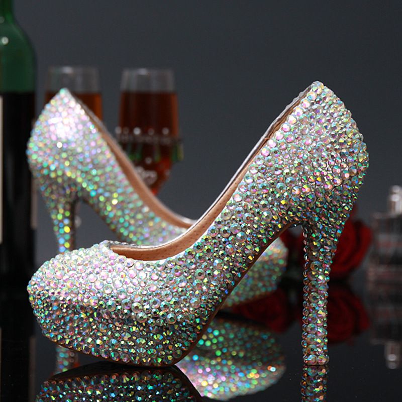 Pointed Toe Silver Pumps Ab Color Bridal Shoes Rhinestone High Heel