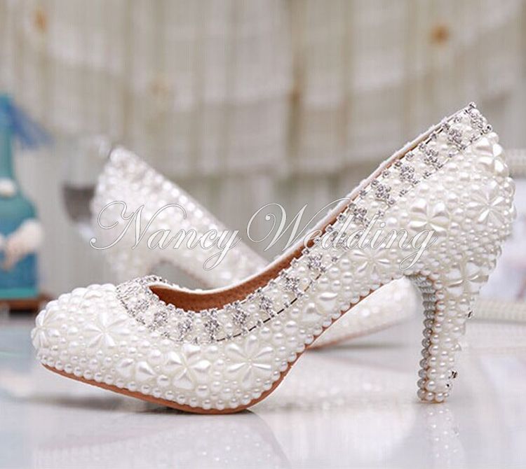 2018 New Arrival Pearls White Wedding Shoes 7cm High Heel Bridal