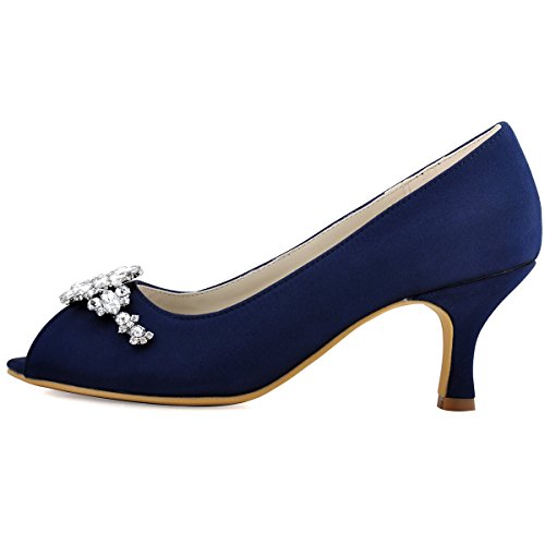 Erijunor E1604 Women Pumps Low Heel Rhinestone Brooch Satin Evening Dress Wedding Shoes Navy Blue 11