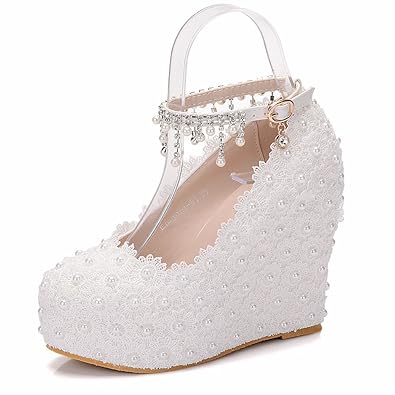 Amazon Com Crystal Queen Wedges Pumps Heels White Lace Wedding