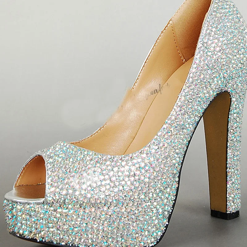 Chunky Heel Wedding Shoes Peep Toe Prom Party Platforms Rhinestone