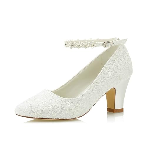 Round Toe Ankle Strap Ivory Lace Bridal Wedding Shoes With Chunky