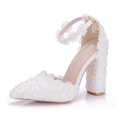 White Bridal Shoes Floral Lace Heels Rhinestone Chunky Heel Pumps