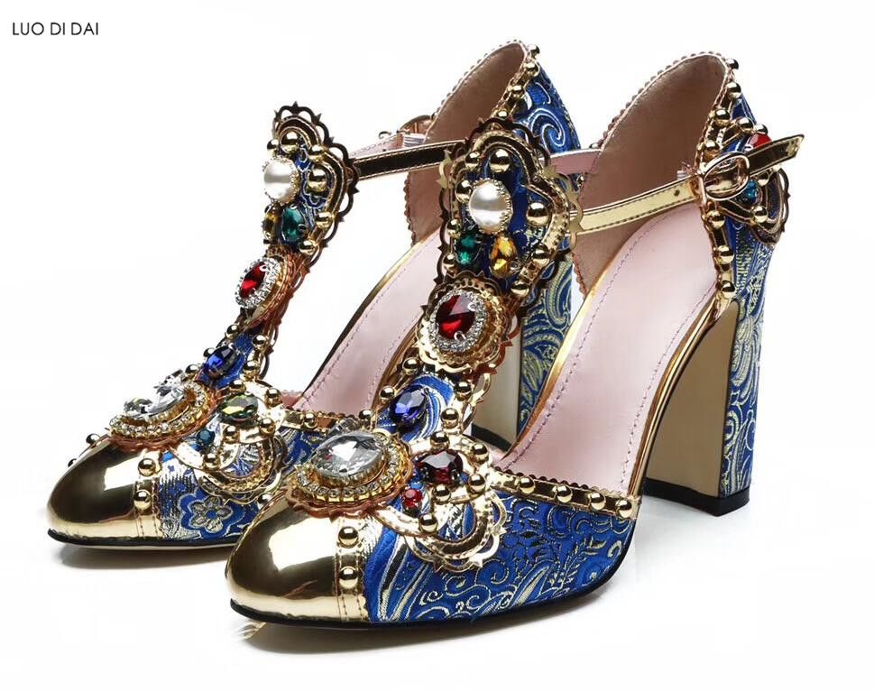 Gold Blue Summer Sandals Rhinestone Chunky Heel Genuine Leather Sexy