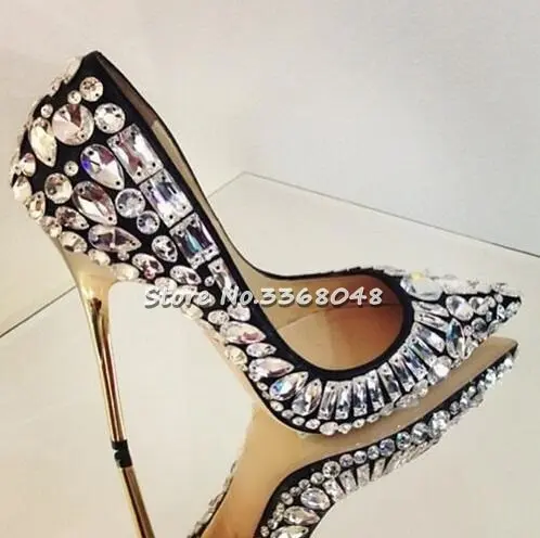 Luxury Black White Crystal Embellished Pumps Gold Stiletto Heels