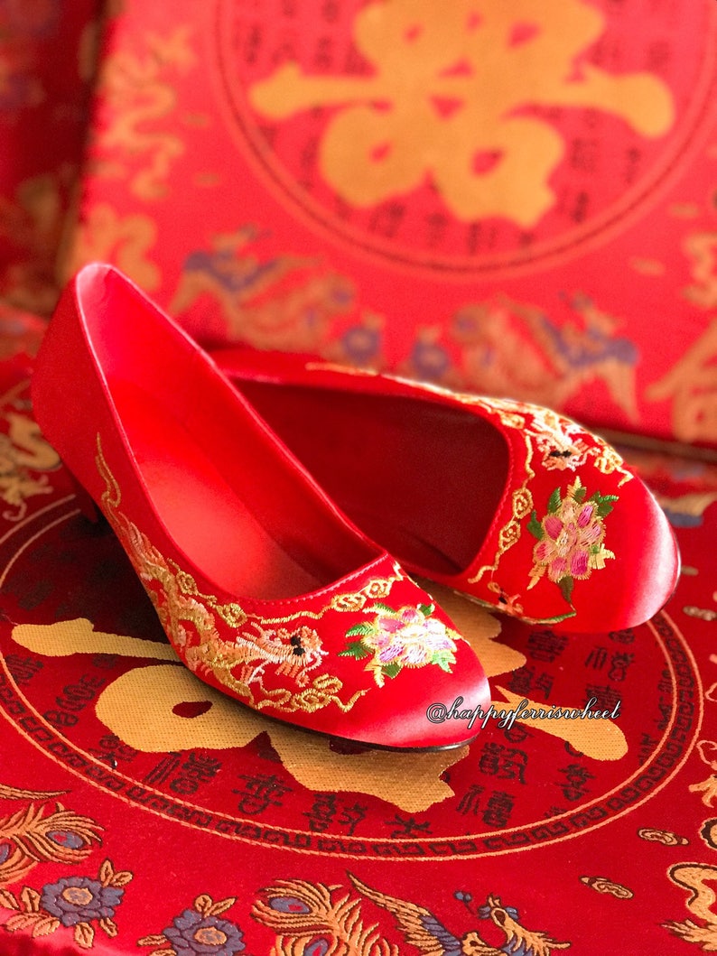 Red Wedding Shoes Short Heels Low Heel Flower Wedding Shoes