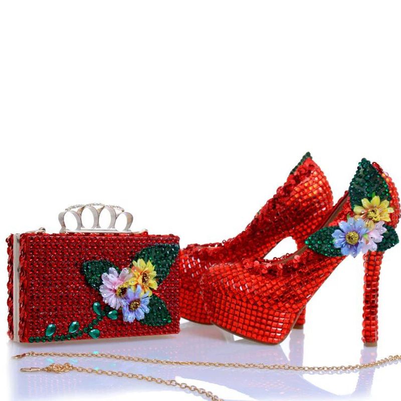 New Design Red Rhinestone Heels With Matching Bag Appliques And Crystal Wedding Bridal Shoes Party Prom Pumps With Clutch