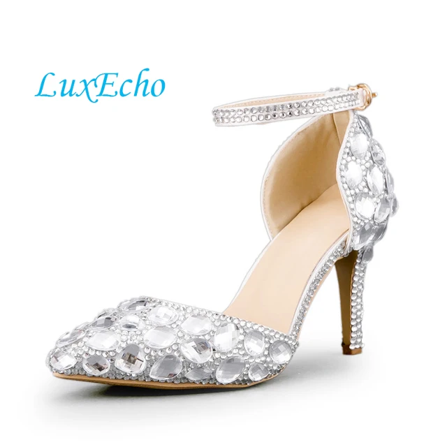 Silver Stones Wemen Wedding Shoes Pointed Toe Thin Heels Dress Shoes