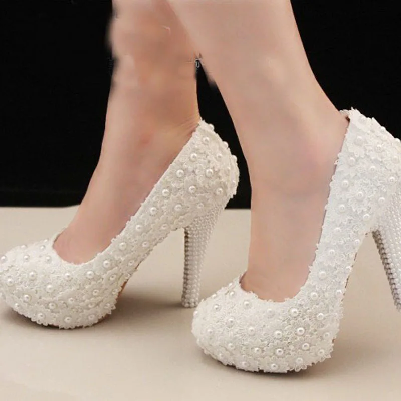 Wedding Shoe Woman New Lace Bride Yarn Shoes Pearl High Heels
