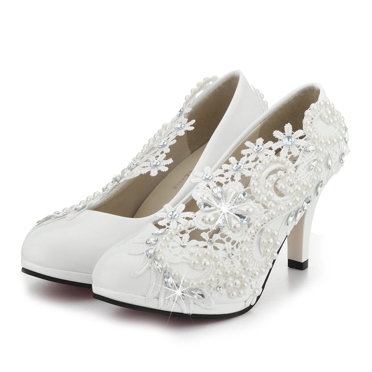 Womens Heel White Flower Lace Crystal Wedding Shoes Prom Bridal