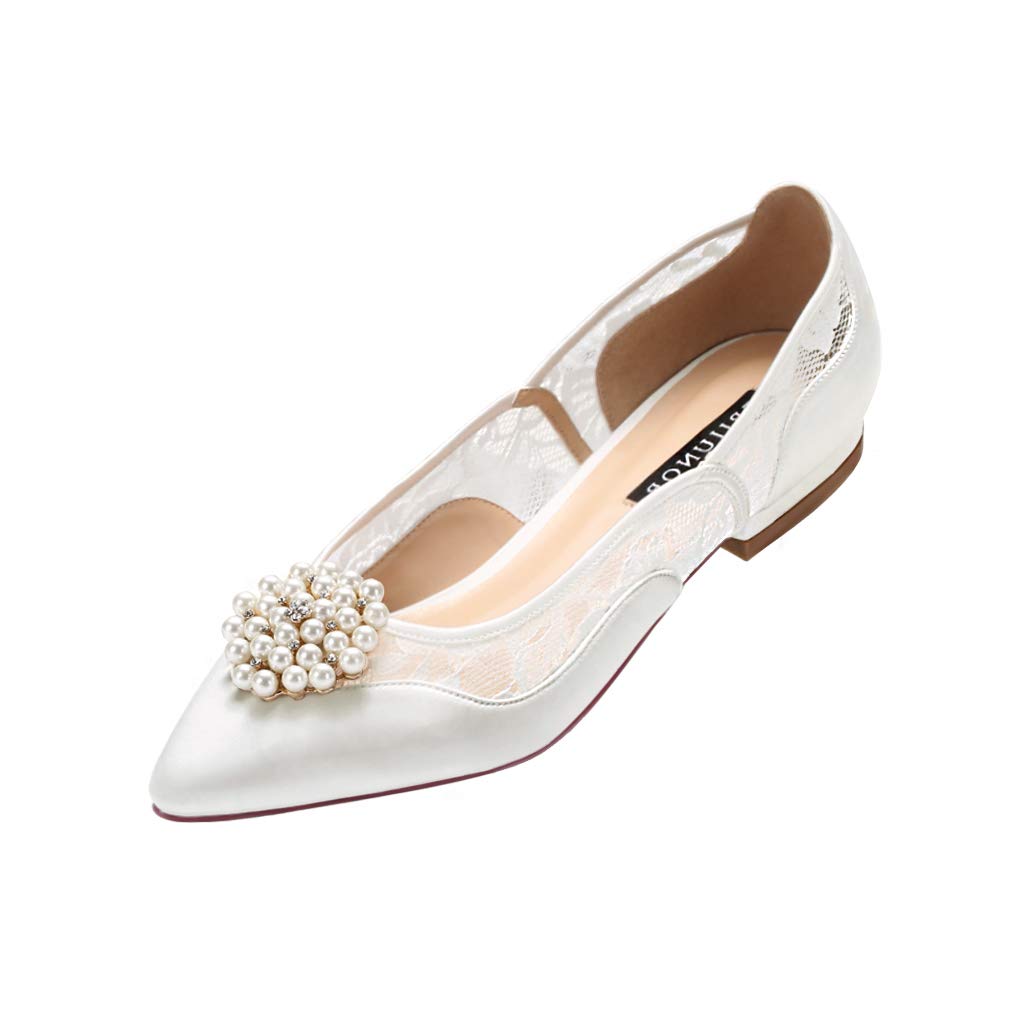 Erijunor Lace Wedding Shoes Flats Ivory Satin Pointy Toe Comfortable