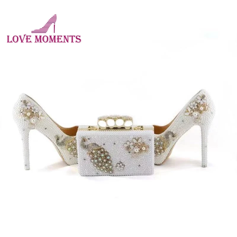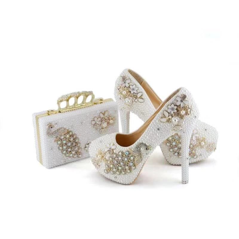2019 Design White Pearl Women Wedding Shoes With Matching Bags Bride